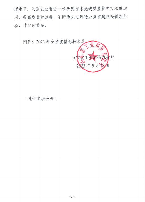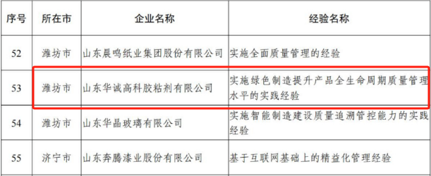 山東華誠(chéng)高科膠粘劑有限公司于2023年9月24日獲得山東省工業(yè)和信息化廳發(fā)布的全省質(zhì)量標(biāo)桿榮譽(yù)認(rèn)定。